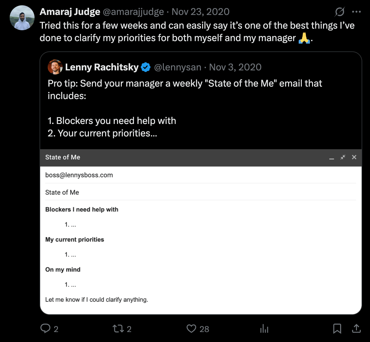 When COVID hit and everyone went remote, I needed a way to showcase my work and help my manager help me. I discovered a framework from a tweet by Lenny Rachitsky called the "State of Me" update and adapted it for my purposes. (I even tweeted at Lenny after using it successfully for weeks—and he reposted it!)