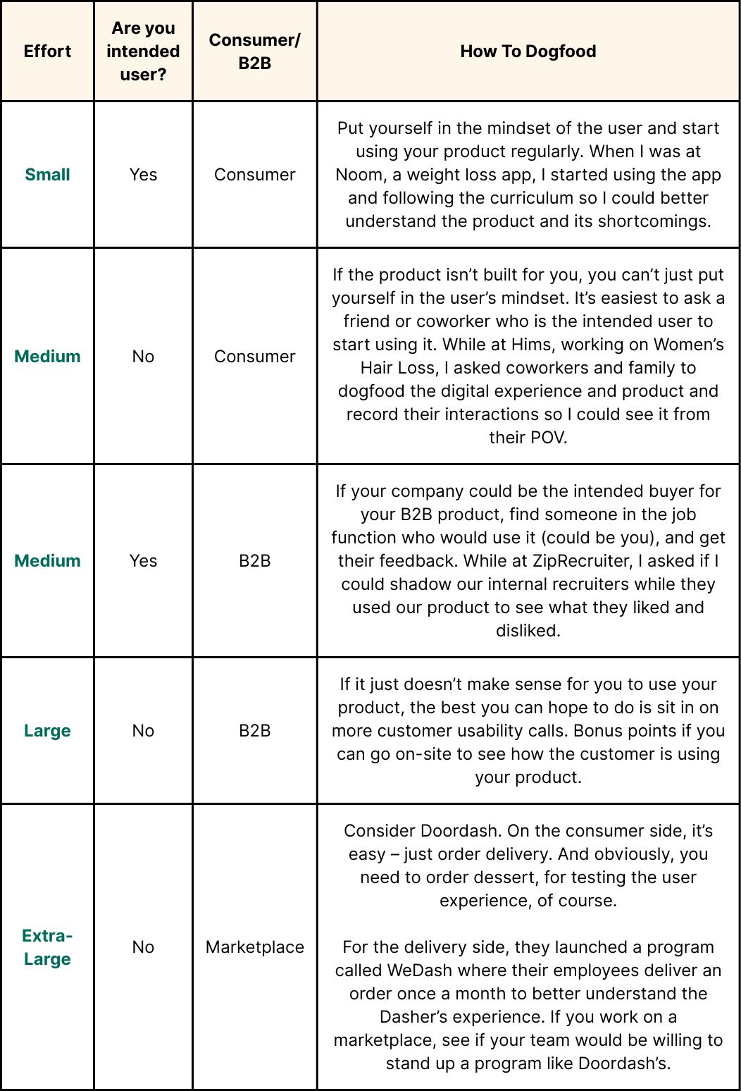 Unfortunately, it’s not always easy to do. Some products are easier to dogfood than others. And so I’ve created categories based on t-shirt sizing for the amount of effort it will take to properly dogfood them. (As a side note, I can’t imagine it’s easy to dogfood dog food if you’re a dog food company since you’re not a dog. Say that five times fast.)
